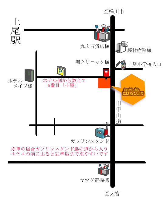 JR高崎線上尾駅東口を出て、旧中山道(県道164号)をさいたま市方面へ徒歩3~4分。